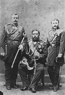 In this capacity, Judd traveled with Kalākaua on his 1881 world tour along with their childhood classmate Armstrong and Colonel George W. Macfarlane, the king's aide-de-camp.[14][15] Judd's dark complexion and physical resemblance to Kalākaua led a few people, including Qing politician Li Hongzhang to mistake him for a Native Hawaiian, and the 5th Earl Spencer mistook him for the king.[16] According to the Evening Star, a Washington, D. C. newspaper, "Col. Judd looks very much like Kalakaua, except that he wears a moustache simply. He was born in the islands, of New York parentage, but is burned as brown as a nut."[17]