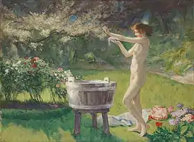 Not achieving the expected success with this work, Hermans turned to smaller scale works often depicting charming women, which were based on the studies he had made for the Masked ball. These works are in the same vein as the society portraits of Alfred Stevens. He also painted at the sea from which he returned with fantasies of nude women bathing and Bacchantes. A new high point of this period is the composition Circe as temptress, which shows a seductive woman in a modern interior with a man passed out at a table with an overturned wine glass. This was a return to the veiled social criticism of his earlier work. In his later years he painted large decorative works and landscapes with many figures. During World War I he treated some wartime subjects such as The martyrs and the Execution of Edith Cavell by the Germans.[3]