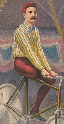 ![]() A lithograph of Kilpatrick riding his bicycle, circa 1900 | |