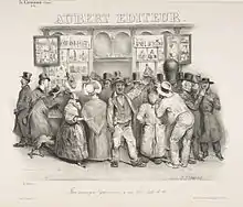 The testimony of his contemporaries emphasizes Philipon's charisma who inspired writers and caricaturists in his employ.[7] Himself focusing on lithographs, his publishing house had an almost complete monopoly on this type of publication as of 1831, with a third of all lithographs published in Paris coming from him.[8]