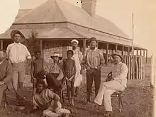 Patrick Byrne worked at the telegraph station for 50 years,[11] after commencing as a teenager (c.1873).[14] Also known as Paddy or Pado, Byrne corresponded with Spencer and collected specimens for biological analysis for many years. Spencer named a small marsupial known locally as the kowari in recognition of Byrne's contribution as Dasyuroides byrnei, and Byrne's work continues to contribute to scientists' understanding of central Australian mammals.[15] He was also reportedly a blacksmith, and buried his dog at the back of the building in a small grave surrounded by ironwork railings, which still exists.[11] Byrne is mentioned in Erlikilyika's biographical entry in the Australian Dictionary of Biography as appreciating his skills and talent.[16] He was step-brother to Amelia Gillen, wife of Frank.[17] Byrne has been identified as the man on the right in the photograph above.[18]