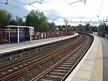 ![]() Platforms 1 and 2, with the footbridge, constructed in 2011, clearly visible in the background. | |