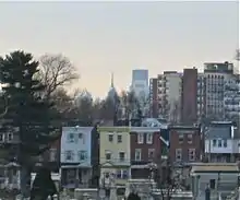 After crossing over Washington Lane, Cheltenham Avenue passes many strip malls and busy residential neighborhoods. After passing a small cemetery on the right (where the skyline of Philadelphia is just visible), Cheltenham Avenue intersects with the northern terminus of Broad Street. Immediately following the Broad Street intersection is the southern terminus of PA 309. Soon after, Cheltenham Avenue intersects PA 611 and historic Old York Road.
