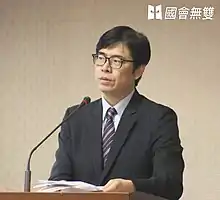 In the 2012 legislative elections, Chen was placed on the DPP electoral list, from which 13 members were elected based on the number of votes the DPP received. Being the eighth member on the list, Chen returned to the Legislative Yuan once again as a legislator in February 2012.[28] He was reelected via proportional representation in 2016. Chen faced fellow lawmakers Chao Tien-lin, Lin Tai-hua, and Kuan Bi-ling in a Kaohsiung mayoral primary held in March 2018, and was named the Democratic Progressive Party candidate for the mayoralty.[29][30] On November 24, 2018, he was defeated by Han Kuo-yu, the Kuomintang mayoral nominee, by more than 150,000 votes. Chen became the first DPP mayoral candidate to lose in the special municipality of Kaohsiung, established in 2010. His defeat marked the end of 20 years of Democratic Progressive Party governance in the old city area of Kaohsiung, and 33 years of governance in the old Kaohsiung County area.