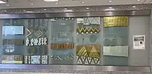 The patterns on Riley's African Textile Glass Panels, displayed at the Hartsfield-Jackson Atlanta International Airport, hark back to our ancestors in Africa, the mother continent for all humans. The layers are both horizontal and three-dimensional, the stacked design is achieved by carving into the front and back of the glass and applying a variety of tissue thin metal lead sheets to the back.[28][29]