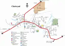 The John Hart Highway portion of Highway 97 runs east–west through Chetwynd, connecting the town to Dawson Creek (102 km [63 mi] east) and Prince George (304 km [189 mi] south). Highway 29 (Don Philips Way) runs north–south through Chetwynd, connecting the town to Hudson's Hope (60 km [37 mi] north) and Tumbler Ridge (89 km [55 mi] southeast). The downtown core lies just west of the intersection of Highway 97 and Highway 29. Chetwynd's internal street network has 28 kilometres (17 mi) of paved road,[38] which uses the highway as its main arterial road with parallel frontage roads for local trips. A site plan by the province in 1957 laid out the basic structure of the town.[4]