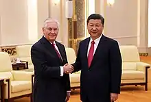 Every US president since Nixon has toured China, with the exception of Jimmy Carter. The Obama administration signed a record number of bilateral agreements with China, particularly regarding climate change, even as its East Asian pivot strategy strained relations. The advent of the Xi administration would prefigure a sharp downturn in these relations, which was then further entrenched upon the election of President Donald Trump, who had promised a combative stance towards China as a part of his campaign, which began to be implemented upon his taking office. Issues included China's militarization of the South China Sea, alleged manipulation of the Chinese currency, and Chinese espionage in the United States.[2][3][4] The Trump administration would label China a "strategic competitor" in 2017.[5][6] In January 2018, Trump launched a trade war with China, which the Chinese characterized as part of the unjustified containment strategy begun by the American pivot towards the Asia-Pacific. The United States government banned American companies from selling equipment to various Chinese companies linked to human rights abuses in Xinjiang, among them the tech conglomerate Huawei.[7][8][9] The US revoked preferential treatment towards Hong Kong after the passage of a broad-reaching security law in the city, increased visa restrictions on students from China,[10][11] and deepened relations with Taiwan. In response, China adopted a so-called 'wolf warrior diplomacy', countering American accusations of human rights abuses.[12] By early 2018, various geopolitical observers had begun to speak of a new Cold War between the two powers.[13][14][15][16] On the last day of the Trump administration in January 2021, the US officially recognized the Chinese government's treatment of the Uyghurs in Xinjiang as a genocide.[17]