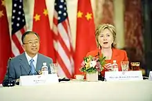 The Strategic Economic Dialogue initiated by then-US President Bush and Hu and led by US Treasury Secretary Henry Paulson and Chinese Vice Premier Wu Yi in 2006 was broadened by the Obama administration into the U.S.–China Strategic and Economic Dialogue.[111]: 288 It was then led by US Secretary of State Hillary Clinton and US Secretary of the Treasury Timothy Geithner for the United States and Vice Premier Wang Qishan and Chinese State Councilor Dai Bingguo for China. The focus of the first set of meetings in July 2009 was in response to the economic crisis, finding ways to cooperate to stem global warming and addressing issues such as the proliferation of nuclear weapons and humanitarian crises.[112]