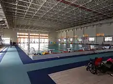 Sports facilities include a multifunction gymnasium, a goalball hall, four indoor and five outdoor tennis courts, two outdoor soccer fields, two archery fields, a velodrome, outdoor athletic field with a grandstand, a swimming hall and fishing pond. In total there are 72,382 square metres (779,110 sq ft) of buildings and 68,183 square metres (733,920 sq ft) of outdoor sports facilities.[1]