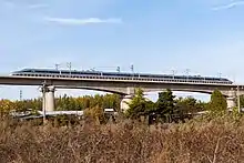 The CRH380BJ-0301 (initially CIT400B) is a 380 km/h (236 mph) CIT train, co-manufactured by the CNR Tangshan and CNR Changchun factories.[8] The design is based on CNR's CRH380CL trainset, with a formation of 6M2T, a designed top speed of 500 km/h (311 mph), and a top operating speed of 400 km/h (249 mph).