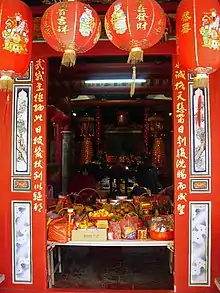 Within temples, it is common to see banners bearing the phrase "if the heart is sincere, the god will reveal their power" (Chinese: 心誠神靈 xin cheng shen ling).[125] The relationship between people and gods is an exchange of favour.[125] This implies the belief that gods respond to the entreaties of the believer if their religious fervour is sincere (cheng xin Chinese: 誠心).[125] If a person believes in the god's power with all their heart and expresses piety, the gods are confident in their faith and reveal their efficacious power.[125] At the same time, for faith to strengthen in the devotee's heart, the deity has to prove their efficacy.[125] In exchange for divine favours, a faithful honours the deity with vows (huan yuan Chinese: 還願 or xu yuan Chinese: 許願), through individual worship, reverence and respect (jing shen Chinese: 敬神).[125]
