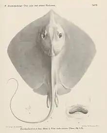 The Chinese stingray was originally described as Trygon sinensis by Austrian Franz Steindachner, in an 1892 volume of the scientific journal Denkschriften der Mathematisch-Naturwissenschaftlichen Classe der Kaiserlichen Akademie der Wissenschaften in Wien.[2] The type specimen is a male 38 cm (15 in) across, collected from Shanghai, China.[3]