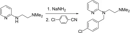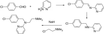 The preparation begins with the condensation of 4-chlorobenzaldehyde with 1,1-dimethyethylenediamine. The resulting Schiff base is reduced. The resulting amine is then further reacts with 2-bromopyridine in the presence of sodamide.