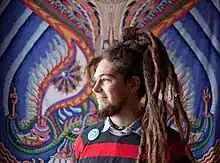 Chris Dyer (born March 3, 1979) is a Peruvian–Canadian artist based in Montreal, who exhibits, performs and teaches his art worldwide. Some of his broader artistic themes include consciousness, truth, oneness, introspection, personal development and kindness.[1] He paints using acrylic, pencil, pen, spray paint, gouache and other media on a variety of different forms, including broken or blank skateboards in his early years, various sculptured and recycled items, and now commonly fabric or wood canvas. He is also known for his murals, logos, album covers, posters, illustrations, comic books, travel diaries (The Sunlight Chronicles),[2] and YouTube adventure vlogs (Artventures).[3] He was the art director and brand manager of Creation Skateboards/Satori Movement[4] for three and a half years, creating designs for hundreds of skateboard decks. He teaches many art workshops and classes on technique, spray painting, traditional medicinal healing,[5] and the business of art, as well as offering an online class.[6] He has created his own brand of conscious clothing and other goods, Positive Creations, which features some of his most well-loved art.[7] Though his styles, mediums and subject matters are always in flow, the main theme seen through his artwork is cultural and spiritual oneness of humanity and beyond.