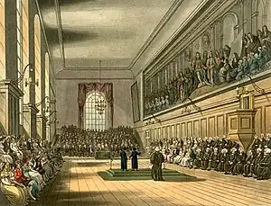 This engraving was published in The Microcosm of London (1808) shows the Great Hall on St Matthew's Day, 21 September. On this day, two Grecians destined for scholarships to Oxford and Cambridge universities gave orations in praise of the school, one in Latin and the other in English. The Verrio painting can be seen along the wall on the right.