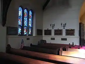 In the 1870s a Carpenter Gothic style building was erected. In 1925 it was greatly enlarged and encased in stone. Those additions also included striking stained glass windows. President Theodore Roosevelt attended church here, and his wife and children were active members. Roosevelt's funeral service was held here in 1919. Today Christ Church is a featured site on the Oyster Bay History Walk audio walking tour.