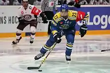 In 2006, he moved to Europe and played for Storhamar Dragons in the GET-ligaen in Norway during the 2006-07 season. There, he was named Most Valuable Player in the playoffs. He scored a record 32 points in 17 playoff games.[1] The two following seasons he spent with Rødovre Mighty Bulls in Denmark.