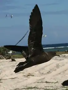 The species closely resembles the sooty (Puffinus griseus) and short-tailed shearwaters (P. tenuirostris), but has dark brown underwings and is smaller. The short tail of the Christmas shearwater does not appear blunt except when spread, but in flight usually tapers to a point, enhanced by the feet which protrude beyond the tail-tip. It often flies in a leisurely way like the related Procellariidae, and thus can be mistaken for a petrel. In particular, it can appear similar to the extremely rare Fiji petrel (Pseudobulweria macgillivrayi), a gadfly petrel-like relative of the shearwaters. The two species share a similar morphology and colouration, but the bulbous head and rather thin long bill – typical for shearwaters – distinguish P. nativitatis from the slim-headed thick-billed Fiji petrel.[7]