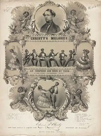 Besides Christy himself, the troupe originally included Christy's stepson George Christy, often considered the greatest blackface comic of the era. When by September 1855 George and Edwin Christy had retired from the group, the company continued under the name of 'Christy's Minstrels', until Edwin Christy took out an injunction to prevent them.[4] Christy was emotionally affected by the American Civil War, and committed suicide in 1862.[5]