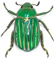 The adult beetles are 20 to 30 millimetres (0.8–1.2 in) long,[4][5] and are bright green with silver stripes on the elytra (red and purple color forms occur but are very rare).[1] These iridescent stripes on the cuticle of the elytra are a result of cholesteric liquid crystal organization of chitin molecules.[6] The differences in color are a result of the microscopic structure of each section, with green reflected from cusp-like structures and silver reflected from flat layers parallel to the surface of the elytra.[7] As established through Mueller matrix spectroscopic ellipsometry,[8][9] the optical properties change with the incidence angle of the propagating light. The polygonal cells in the green stripes generate self-healing Bessel beams.[10]