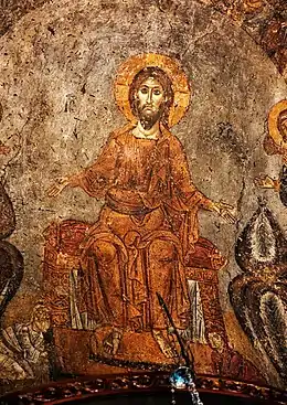 In the narthex the walls are painted with the Last Judgment, with Christ the Judge seated above the royal door into the naos.[19] Again, Anna Tsitouridou associates the prominence of the final judgment with the funerary nature of the monument.[18]