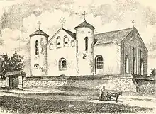 The church was initially built in a symmetrical way with three naves supported by four columns. After the church was damaged for the first time, the columns were removed and the church became a single-nave. Dimensionally it is close to the square and has an apse and a sacristy. The facade is flanked by two cylindrical towers with rounded embrasures. Both towers are sixteen meters tall and five meters in diameter with the walls over two meters in thickness.
