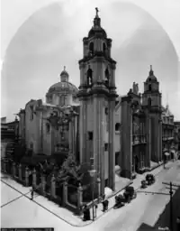 In 1914, a severe fire destroyed the cupola paintings done by Pelegrí Clavé, who had painted the seven sacraments, and "The Triumph of the Holy Cross" on the eight sides of the cupola. The only work saved from that fire was done in 1861 which represents the blessing of Creation situated in the door of the small lantern at the very top of the cupola.[3] Later in the century, this church was the scene of meetings of historians, theologians and other researchers during the beatification process of Juan Diego.[7] The church was declared a historical monument in 1932 and again in 1980. The church building has also seen a number of works to correct damage from its sinking into the soft soil of Mexico City and has had its facade on Madero Street restored.[3][7] It is favored by elegant weddings, particularly since it is half a block from the Casino Español.