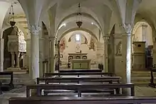 As soon as one enters the church, on the left, there is, in a niche in the wall, an octagonal marble baptismal font, the making of which can be dated several centuries after the construction of the church. The two side aisles are separated from the central one by two parallel rows of round arches supported by a regular alternation, beginning with the second pair, of columns and pillars with a square base. all of which have finely carved capitals.[43] Among these is one characterized by the representation, at the corners, of ram's heads that resemble the same decorations found in the capital located on the outer wall of the left apse, leading one to assume that it is a work by the same author identified as the stonemason Pelegrinus, who was also the author of other works in Verona. On the walls are some fragments of frescoes from different eras, among them can be recognized St. Anthony the abbot, St. George and the dragon with two other saints, some overlapping frescoes dating from the 12th and 14th centuries depicting the Holy Family, St. Francis, St. Helena, and a transcription of an inscription in which it is recalled that the church was decorated in 1184 by a certain Beaguinus.[42][26]