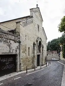To the west, the church of San Giovanni in Valle has a simple salient tripartite facade, made of medium-sized ashlars of tuff that alternate with blocks of maiolica at the highest part, a typical example of the Veronese Romanesque style reminiscent of the facades of the parish church of San Floriano (in Valpolicella), the church of San Severo (in Bardolino) and the abbey of San Pietro in Villanova (San Bonifacio).[27][28]