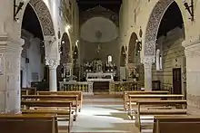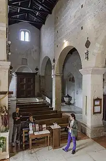 The interior of the church, with a three-nave basilica plan without a transept, is covered with timber roof trusses and is lower than street level by five steps (about one meter). The terracotta floor is not the original one but dates from the 19th century. The interior space is developed on three levels: from the nave, access is gained to the presbytery located above via a wide staircase placed along the central axis about halfway up the church, while two smaller staircases, placed in continuation of the minor naves and covered by a barrel vault, provide access to the lower crypt; such a scheme can be found in other Romanesque churches in the province of Verona, such as Santo Stefano, San Severo, San Zeno, and in the Abbey of Villanova.[42]