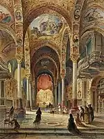 Certain elements of the original church, in particular its exterior decoration, show the influence of Islamic architecture on the culture of Norman Sicily. A frieze bearing a dedicatory inscription runs along the top of the exterior walls; although its text is in Greek, its architectural form references the Islamic architecture of north Africa.[13] The recessed niches on the exterior walls are likewise derive from the Islamic architectural tradition. In the interior, a series of wooden beams at the base of the dome bear a painted inscription in Arabic; the text is derived from the Christian liturgy (the Epinikios Hymn and the Great Doxology). The church also boasted an elaborate pair of carved wooden doors, today installed in the south façade of the western extension, which relate strongly to the artistic traditions of Fatimid north Africa.[14] On account of these "Arabic" elements, the Martorana has been compared with its Palermitan contemporary, the Cappella Palatina, which exhibits a similar hybrid of Byzantine and Islamic forms.[15]