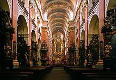 When it was rebuilt, it was rebuilt in the Baroque architecture style. The rebuilding included the addition of over 20 altars. Artists such as Jan Jiří Heinsch, Václav Vavřinec Reiner, and Petr Brandl created paintings for the altars. In 1702, an organ was installed.[2] In 1974 the church was granted the honorary title of minor basilica by Pope Paul VI.