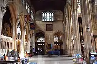 The Trinity Chapel dates from 1430 to 1460 and was endowed for a priest of the nearby Abbey to say masses for the souls of Kings and Queens.[7] It contains a squint which enabled the priest to synchronise the celebration of mass with that at the high altar.[8] The nave was completely rebuilt between 1515 and 1530 and is a remarkable example of late Perpendicular Gothic architecture.[9][6] The tower is fifteenth century and remarkable for the large buttresses which shore it up at its junction with the nave.[10] The great south porch which adjoins the market place was built around 1500 at the expense of Alice Avening.[11] It is elaborately decorated. It was built by Cirencester Abbey around 1480, as an administrative centre and only connected to the church in the 18th century. Between the dissolution of the monasteries and its connection to the church it was used as the town hall.[4][3] The nave was again rebuilt between 1516 and 1530.[2]