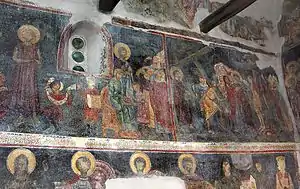 - The frescoes on the half-shaped vault in the naos, today almost destroyed, contained standing representations of Old Testament prophets, as shown by the small remains of the painting. In the southern half and in the eastern part, there are the remains of three standing figures. Comparing the size of the space in the extension, it can be assumed that there were ten figures on that side, that is, on both sides of the vault a total of over twenty.[10]
