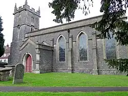 The western tower survives from the building constructed around 1400. The remainder was largely being rebuilt as part of a Victorian restoration in 1838 by Jesse Gane.[2]