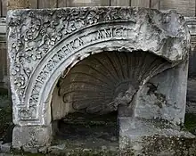 One of the largest decorative marble remains of the site is the niche-head pieces. These massive pieces of marble consist of a concave segment with a large frontal peacock carved in the center, tail fanned out proud. The epigram runs along the semicircle of the carving. Surrounding the peacocks are the spandrels filled with grape vines and leaves.[17] The inscription's letters are raised 11 cm high, and surrounded by realistic grape vines. The detail involved in every individual leaf is remarkable. Each leaf has visible veins, some edges of the leaves are frayed and torn, and the artist even took the time to layer the design, pulling some leaves forward, and carving others in the background, giving the sense of depth.[18] Martin Harrison notes that this workmanship is all done by the artist’s eye, and with no use of a constant measure, as indicated by the marks made by the chisel, minute irregularities, and slight bends in the lattice work. This area was originally painted in vibrant colors. The primary colors used were blues, greens, and some purples. These colors are difficult to find or make and show Anicia Juliana’s power in the decorative aspect of the structure. The background to vines and letters was a bright blue. The peacocks—associated with the goddess Hera and royalty in Antiquity and symbolizing renewal and rebirth for Christians[19] —adorned with carved necklaces, were painted in blues, greens and gold. Due to the empty cavities in the eyes of the remaining bird head pieces, green glass was used for the pupils.[20] They also held chains to suspend something. Connor suggests due to their location, a lamp is a believable use for the chains in their beaks.[19]