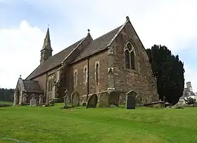 The church, of English Gothic architectural style, is described by Pevsner as Middle Pointed or Decorated Period.[7] The building is of coursed sandstone rubble with ashlar dressings and has a decorative tiled roof with bands of fishscale tiles. The nave, south porch, chancel and north vestry, are in the Decorated style.[8] The nave has two square-headed windows with hoodmoulds. They have cusped ogee-headed lights and spandrels. A square-set bellcote is partly supported by a central buttress at the west end and has similar cusped ogee-headed openings in square surrounds and spirelet with decorative lucarnes, and three-cusped ogee-headed lancets in the chancel.[8]