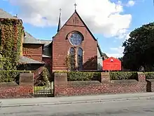 The presbytery is joined to the north side of the church, and has a square plan with a lean-to porch on the south side. It is built in brick with a hipped slate roof, and is in two storeys with attics. The two-bay west front contains a canted bay window on the right, a three-light mullioned window to the left, and two similar three-light windows in the upper floor. On the west and south sides are dormers with hipped roofs and finials, and on the apex of the roof is a cruciform chimney stack.[3]