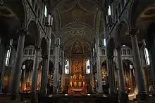 The vault of the Gesù consists of five arches. It is adorned with frescoes by American painter Daniel Muller, who replicated work from the German school of Düsseldorf, depicting the life of Jesus.[1] In this church, there is a statue of Notre-Dame-de-Liesse, brought from France in 1877, which contains the ashes of the original statue burned during the French Revolution.