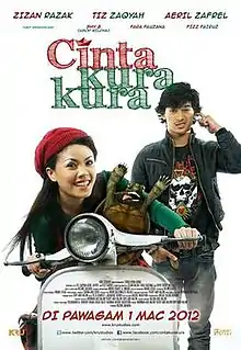 Cinta Kura Kura ("Tortoise love") is a Malaysian Malay-language comedy film produced by KRU Studios in 2012. It features Tiz Zaqyah, Aeril Zafrel and Zizan Razak.It is set for release on 1 March 2012. This films tells us about Nani, a bubbly 21-year-old girl and her unique pet tortoise, Nico.[1][2][3][4][5][6][7]