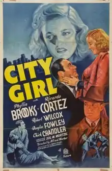 City Girl is a 1938 American crime film directed by Alfred L. Werker and written by Lester Ziffren, Frances Hyland and Robin Harris. The film stars Ricardo Cortez, Phyllis Brooks, Robert Wilcox, Douglas Fowley, Chick Chandler and Esther Muir. The film was released on January 7, 1938, by 20th Century Fox.[1][2][3]