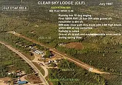 Clear Sky Lodge Airport has one runway designated 2/20 with a 2,500 by 20 ft (762 x 6 m) gravel and dirt surface. For 12-month period ending December 31, 2005, the airport had 800 aircraft operations, an average of 66 per month, all of which were general aviation.[1]