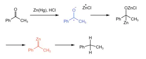 Despite the reaction being first discovered in 1914, the mechanism of the Clemmensen reduction remains obscure. Due to the heterogeneous nature of the reaction, mechanistic studies are difficult, and only a handful of studies have been disclosed.[9][10] Mechanistic proposals generally invoke organozinc intermediates, sometimes including zinc carbenoids, either as discrete species or as organic fragments bound to the zinc metal surface. Brewster proposed the possibility of the reduction occurring at the metal surface. Depending on the constitution of the carbonyl compound or the acidity of the reaction, a carbon-metal or oxygen-metal bond can form after the compound attaches to the metal surface.[9] Furthermore, Vedeja proposed a mechanism involving the formation of radical anion and zinc carbenoid, followed by reduction to alkane[7][8] (as shown above). However, alcohol and carbanion are not believed to be intermediates, since exposing alcohol to Clemmensen conditions rarely affords the alkane product.[9][11]