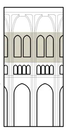 The tendency from the early Romanesque period to the late Gothic period was for the clerestory level to become progressively taller and the size of the windows to get proportionally larger in relation to wall surface, emerging in works such as the Gothic architecture of Amiens Cathedral or Westminster Abbey, where their clerestories account for nearly a third of the height of the interior.[4]