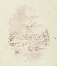 The process was first invented by the English pioneer photographer Henry Fox Talbot "in the autumn of 1834, being then at Geneva" as he later wrote, when he was also developing the photogram, a contact negative process for capturing images of flat objects such as leaves.[9] He described it to the Royal Society (of which he was a Fellow) in 1839.[10] He made a few examples, drawn by unknown other hands but printed by himself. As he explained when sending a copy of the windmill (illustrated), his drawing was too poor; in fact it was this that had spurred him to investigate photography.[11] Two months after this two Englishmen announced, again to the Royal Society, effectively the same process as their own invention, and there was a dispute, but in the end it was not taken to court. In 1841 it was described in the Art of Engraving by T.H. Fielding, and in another manual on photography by Robert Hunt, but not many people in England seem to have used the process, then or later.[12]