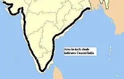 Coastal India is a geo-cultural region in the Indian subcontinent that spans the entire coastline of India.(7516.6 km; Mainland: 5422.6 km, Island Territories: 2094 km)[1]