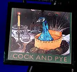 As the name might suggest, the pub was setting for frequent cockfights and traditionally had a distinctive pub sign featuring a large pie upon which a cock was perched.[1] When Cock fighting was banned in 1835 with the Cruelty to Animals Act 1835, a Mr Birch, the proprietor at the time endeavoured to sell the premises.[2]