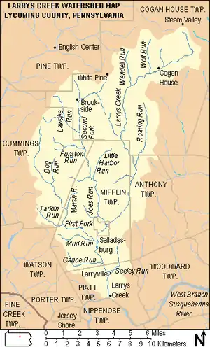 - ↑ For example, during flooding caused by Hurricane Agnes on June 22, 1972, a stream gauge at the nearby village of Cogan House measured discharge 105 times the average, with a peak stream height of 5.29 feet (1.61 m). See: United States Geological Survey. "USGS 01549780 Larrys Creek at Cogan House, PA". Charts, Graphs, Map. Retrieved 2008-05-19. The clearcutting of the 19th century caused floods that were worse.