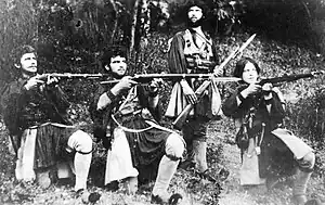 ![]() Cola Nicea (leftmost person) and his band in 1907, in Veria; photograph by the Manaki brothers | |