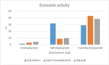 Unemployment in Cold Ashton as of 2011 is at 1.2%, which compares favorably with elsewhere. It's more than two times lower than the South Gloucestershire average of 2.8% and more than three times lower than the national average of 4.4%. This is largely because of much higher levels on self-employment at 32.0%, compared to the county's 8.9% average and 9.8% national average. This makes up for the lack of full-time employment, of which is 29.1% compared to the county's 42.9% average and 38.6% national average.[2]